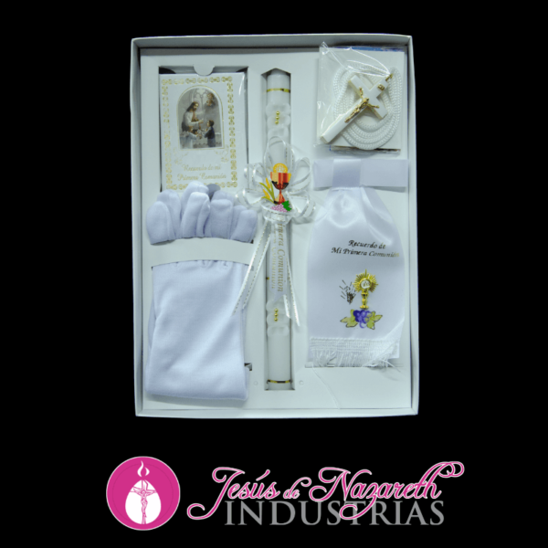 Kit para primera comunión niño. Lleva guante, cinta, cirio, camandula y libro, para estar preparado ese día tan especial.